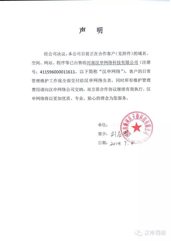 日前,河南汉申网络科技有限公司与信阳天勤科技有限公司正式达成协议,正式全资收购天勤科技全部优质客户资产,协定天勤科技所有客户资源所有权归属于汉申网络,由汉申网络公司团队继续为原客户提供更加优质专业的售后维护与咨询服务。